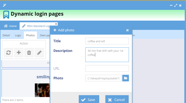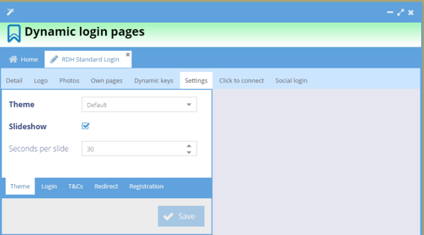 The Photos tab allows you to pull in photos for the background and slide show of the login page.