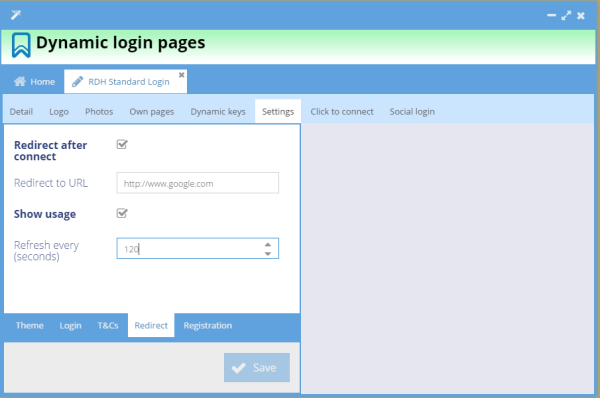 The Redirect Sub-tabs allows you to enter a URL that, once signed-in, the user is automatically directed to this page first. This is ideal for advertizing before the user starts browsing at will.
