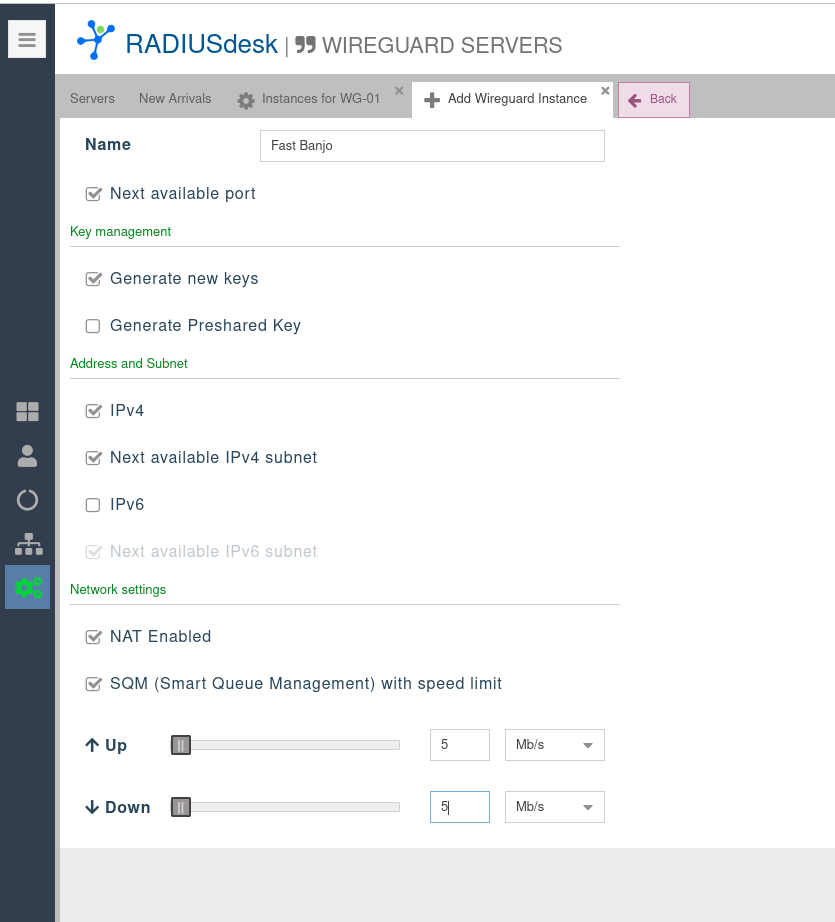 - After you defined a Wireguard Server, you can add Wireguard Instances belonging to the Wireguard server.