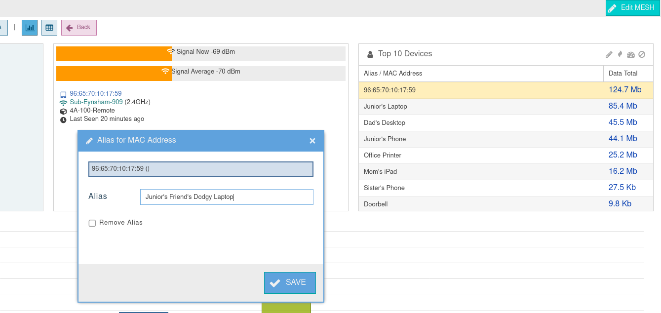 Click on the Pencil Icon in the heading bar of Top 10 Devices to pop-up the Alias for MAC Address window.